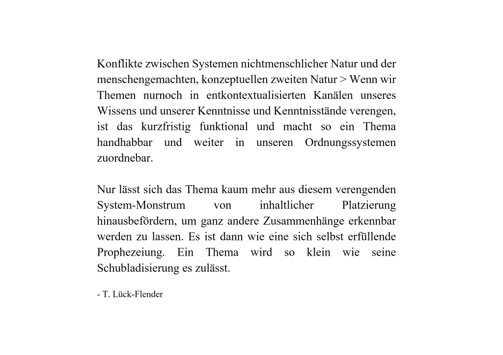 Konflikte zwischen Systemen nichtmenschlicher Natur und der menschengemachten, konzeptuellen zweiten Natur > Wenn wir Themen nurnoch in entkontextualisierten Kanälen unseres Wissens und unserer Kenntnisse und Kenntnisstände verengen, ist das kurzfristig funktional und macht so ein Thema handhabbar und weiter in unseren Ordnungssystemen zuordnebar. Nur lässt sich das Thema kaum mehr…WeiterlesenNichtmenschliche und menschliche Systeme